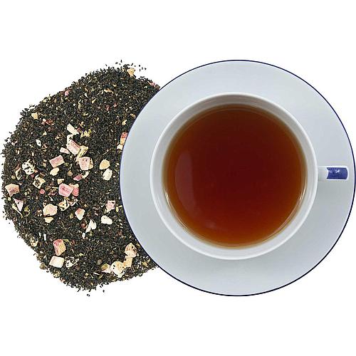 Zutaten: Schwarzer Tee, Himbeerblätter, Himbeerstücke, Aroma, Vanillestücke, Erdbeerblätter, Erdbeerstücke