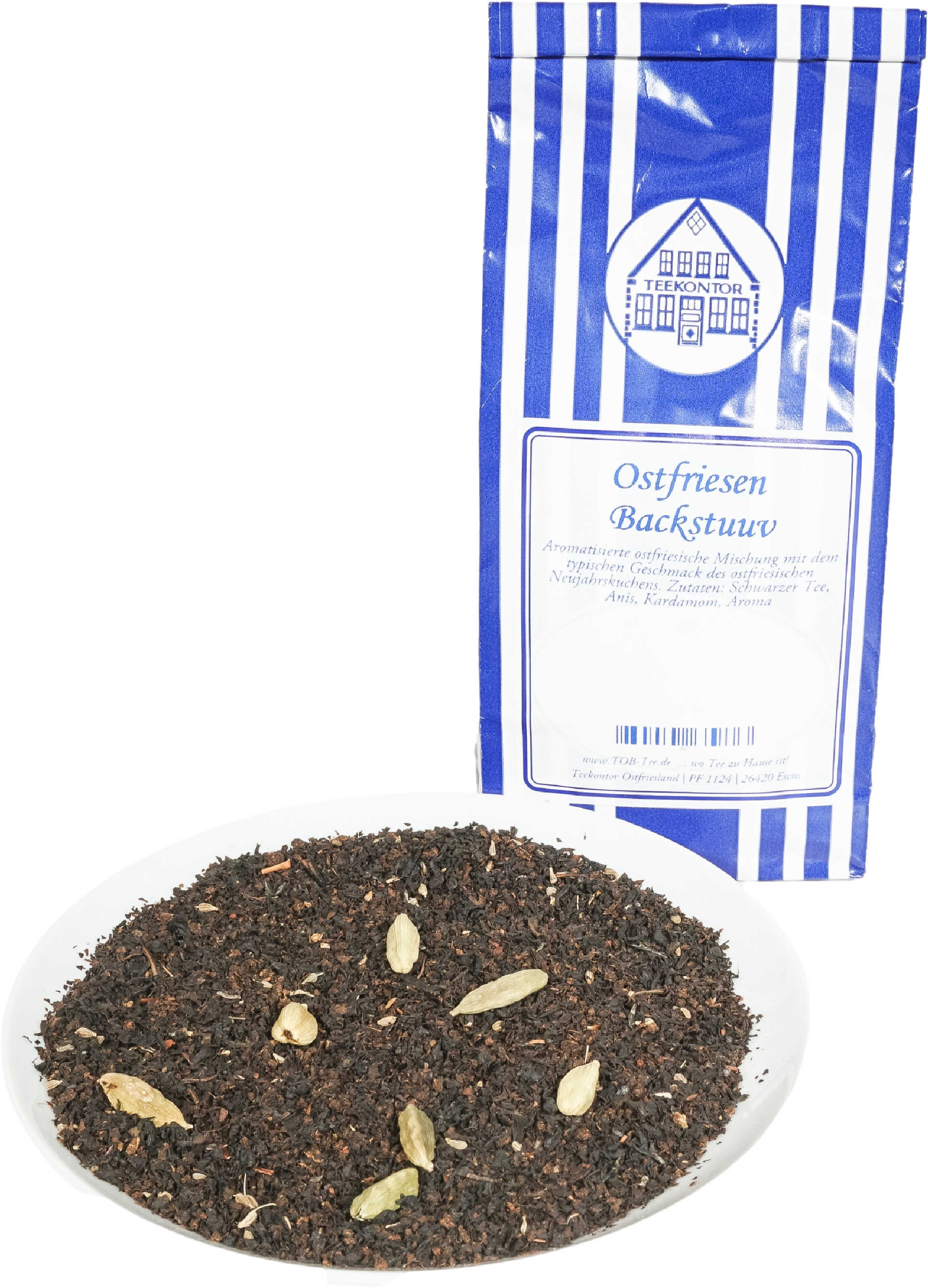 Aromatisierte ostfriesische Mischung mit dem typischen Geschmack des ostfriesischen Neujahrskuchens. Zutaten: Schwarzer Tee, Anis, Kardamom, Aroma