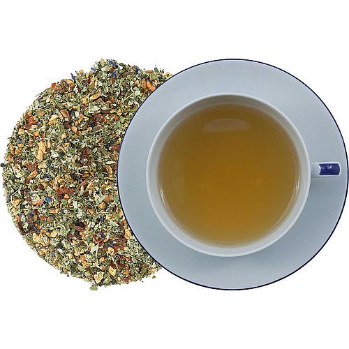 Aromatisierter Kräutertee mit feiner Himbeer-Note und Himbeerblätter, Apfelstücke, Hibiscusblüten, Johannisbeerblätter, Aroma, Ringelblumenblüten, Himbeerstücke, ganze Himbeeren, Kornblumenblütenblätter