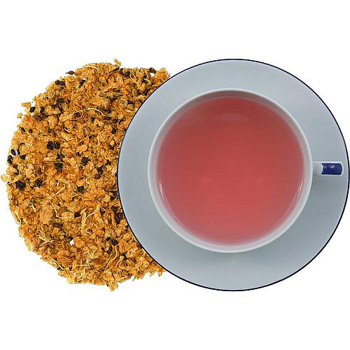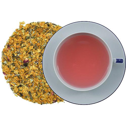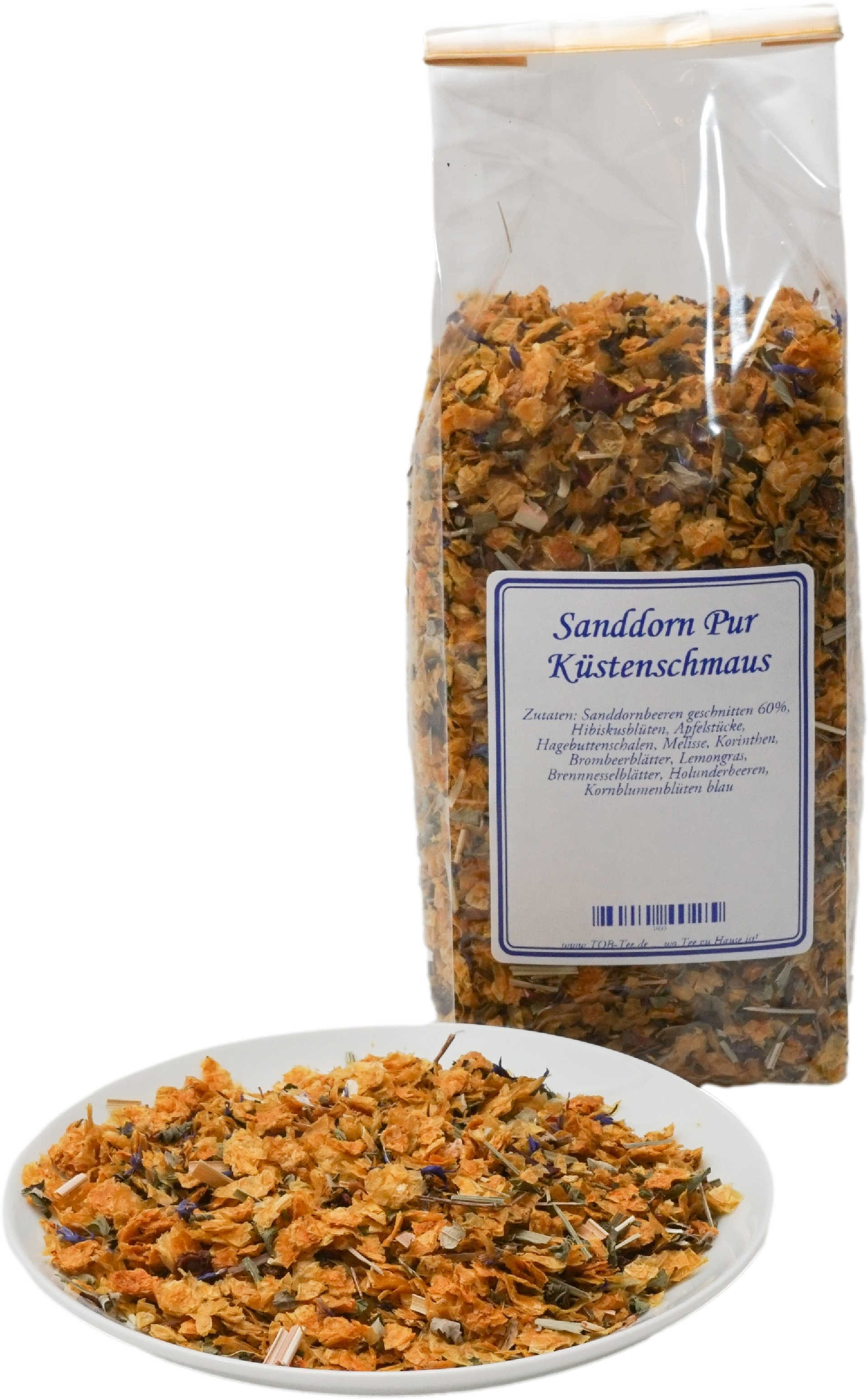 Zutaten: Sanddornbeeren geschnitten 60%, Hibiskusblüten, Apfelstücke, Hagebuttenschalen, Melisse, Korinthen, Brombeerblätter, Lemongras, Brennnesselblätter, Holunderbeeren, Kornblumenblüten blau