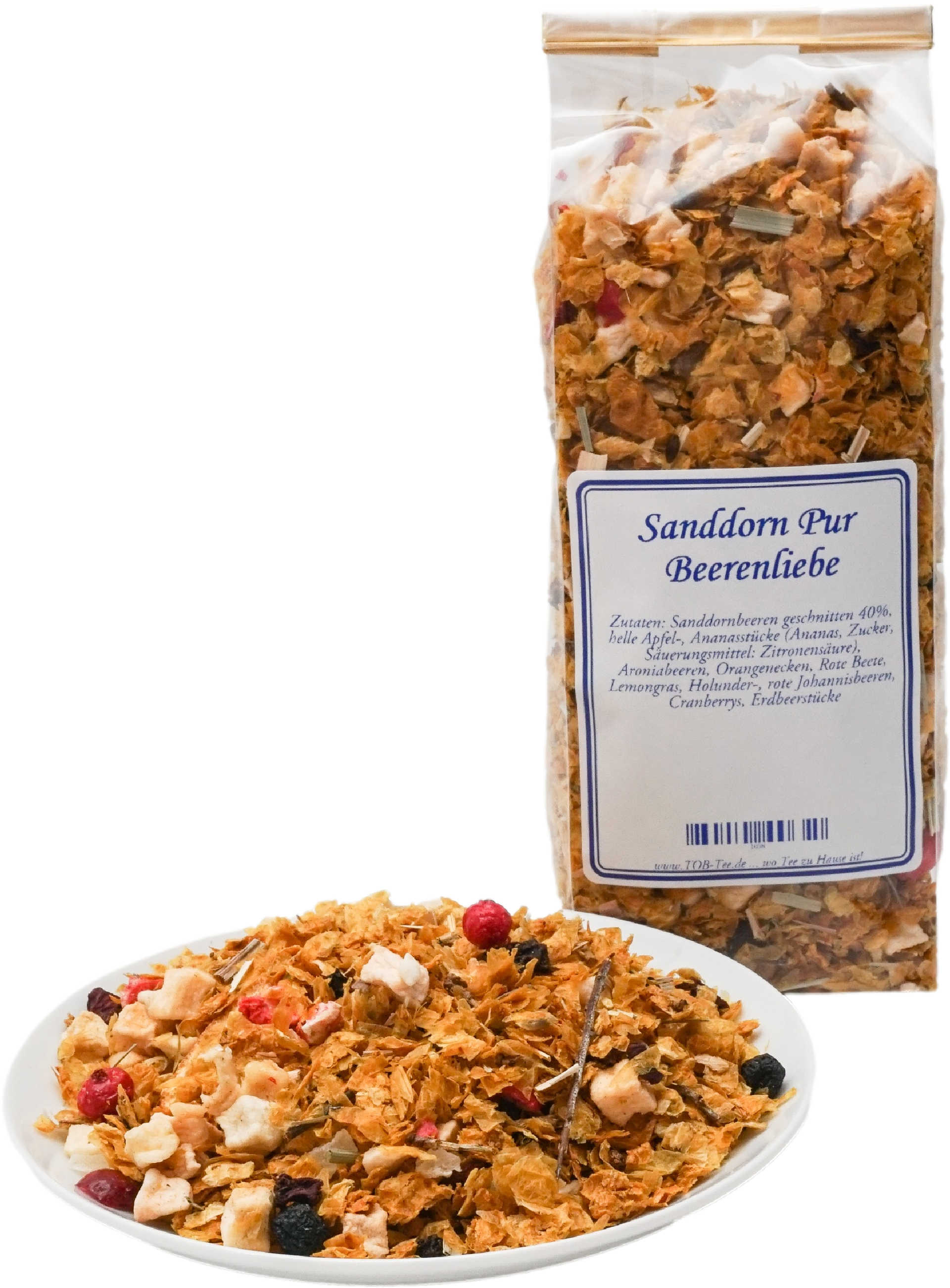 Zutaten: Sanddornbeeren geschnitten 40%, helle Apfel-, Ananasstücke (Ananas, Zucker, Säuerungsmittel: Zitronensäure), Aroniabeeren, Orangenecken, Rote Beete, Lemongras, Holunder-, rote Johannisbeeren, Cranberrys, Erdbeerstücke