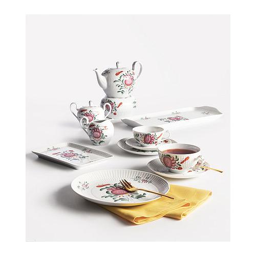 Das 21-teilige Teeservice besteht aus einer Teekanne, 1,2 l, einem Sahnegießer, einer Kluntjedose, sechs Tee-Oberen, sechs Tee-Unteren und sechs Kuchentellern. Hochwertiges Porzellan, spülmaschinenfest und mikrowellengeeignet.
