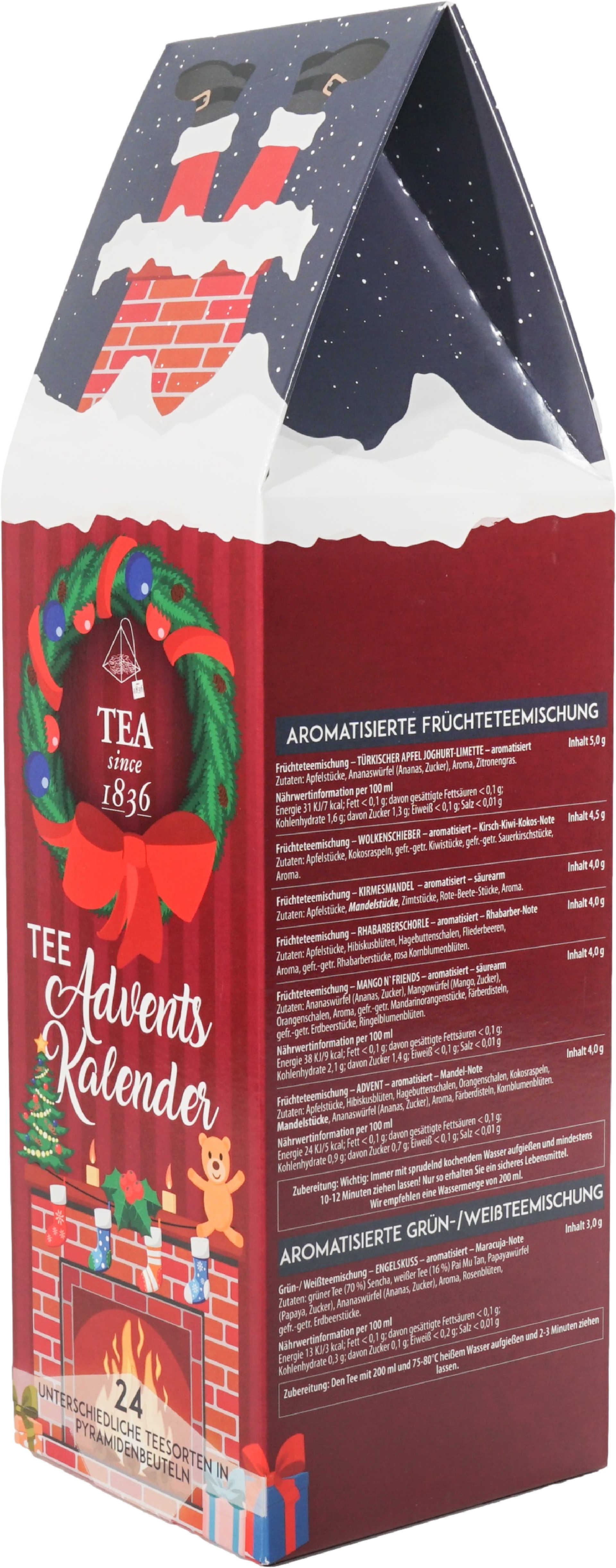 Tee-Adventskalender „Kamin Klassisch“ mit 24 Pyramidenbeuteln einzeln im Sachet verpackt Format 92 x 92 x 305 mm