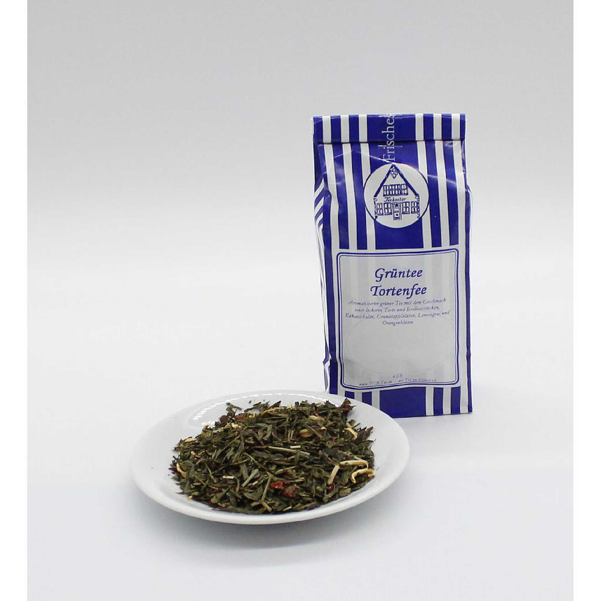Aromatisierter grüner Tee mit dem Geschmack einer leckeren Torte und Erdbeerstücken, Kakaoschalen, Granatapfelblüten, Lemongras und Orangenblüten