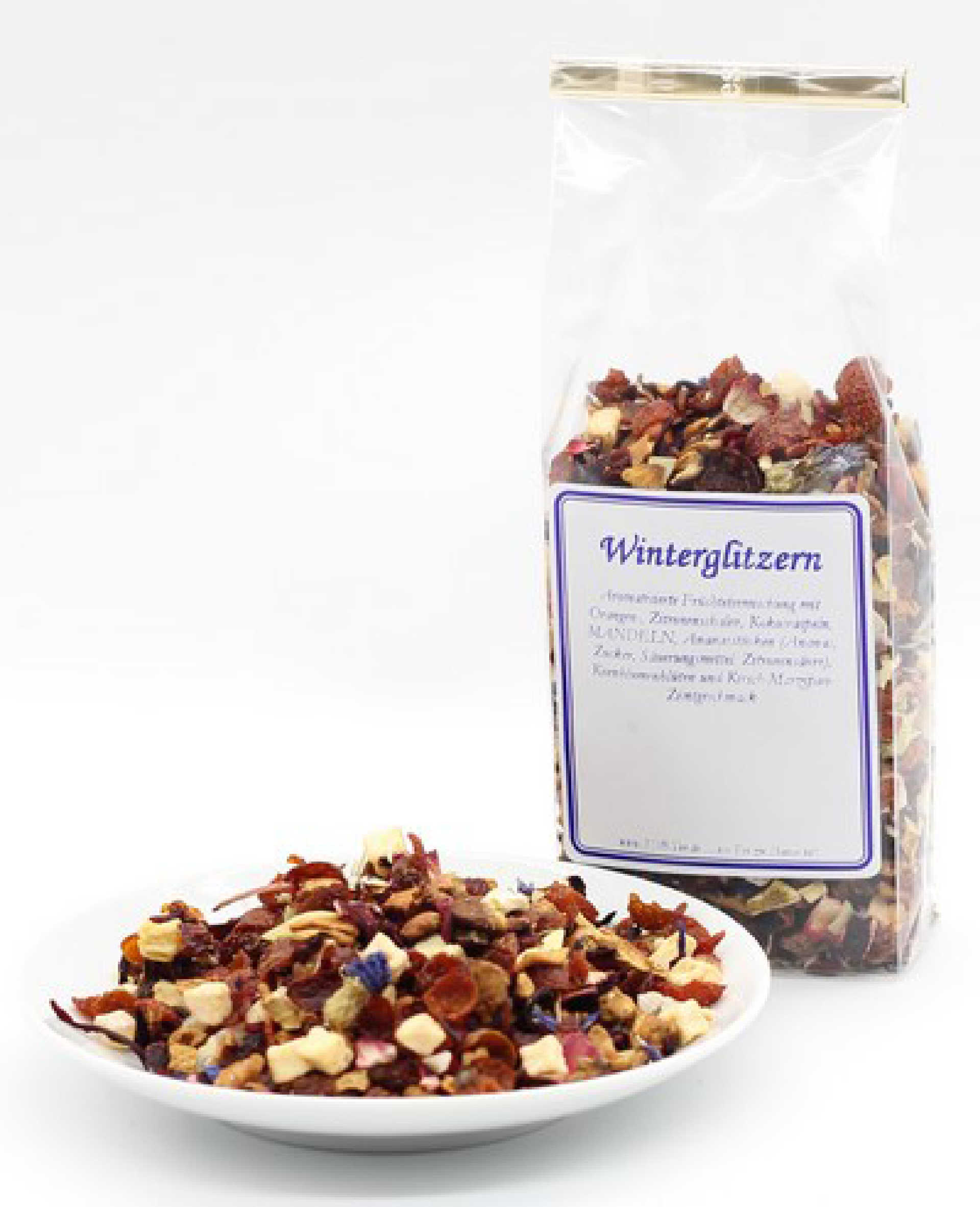 Weihnachtlicher Früchtetee mit Kirsch-Marzipan-Zimt – glänzend in jeder Tasse.