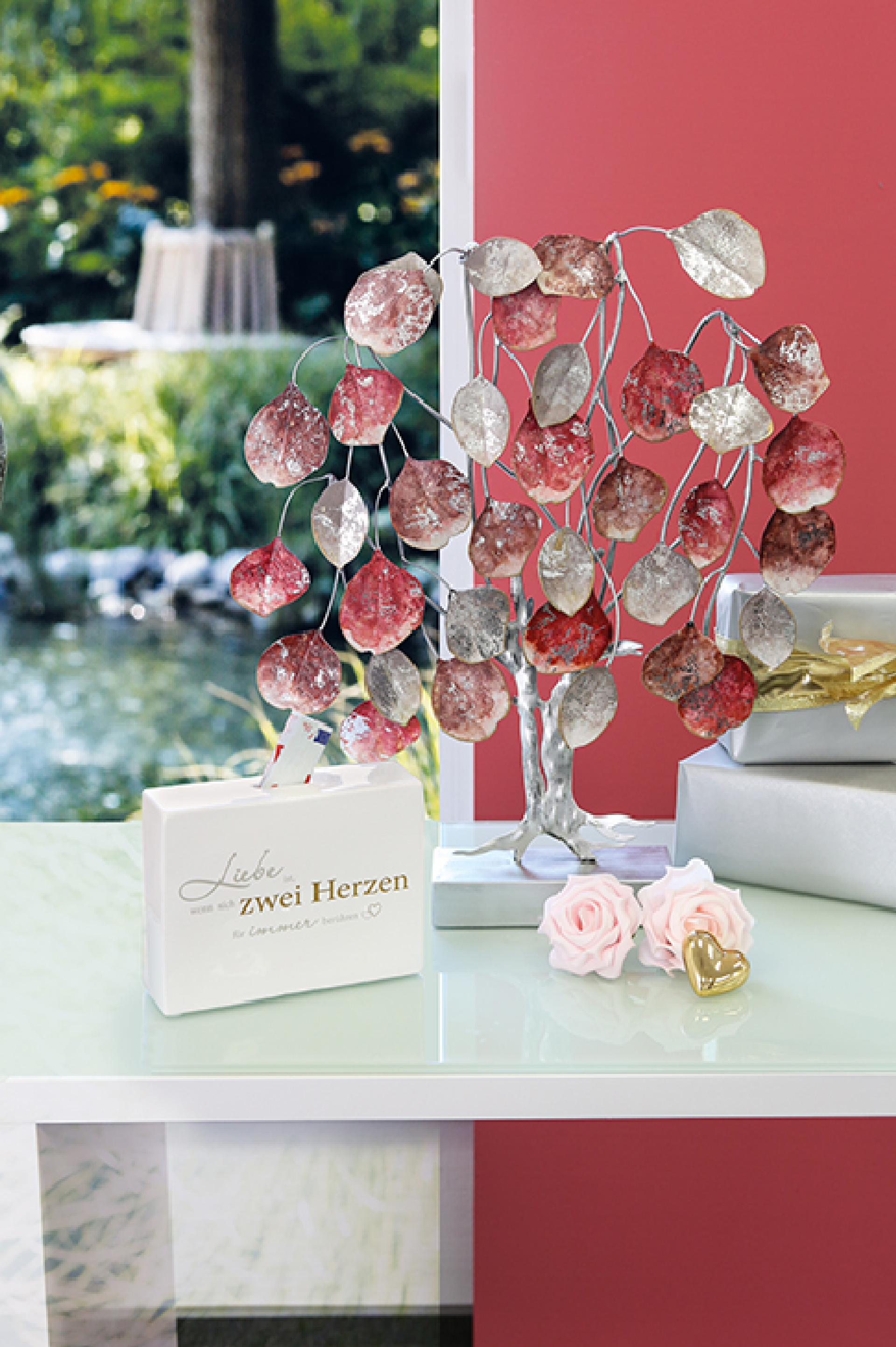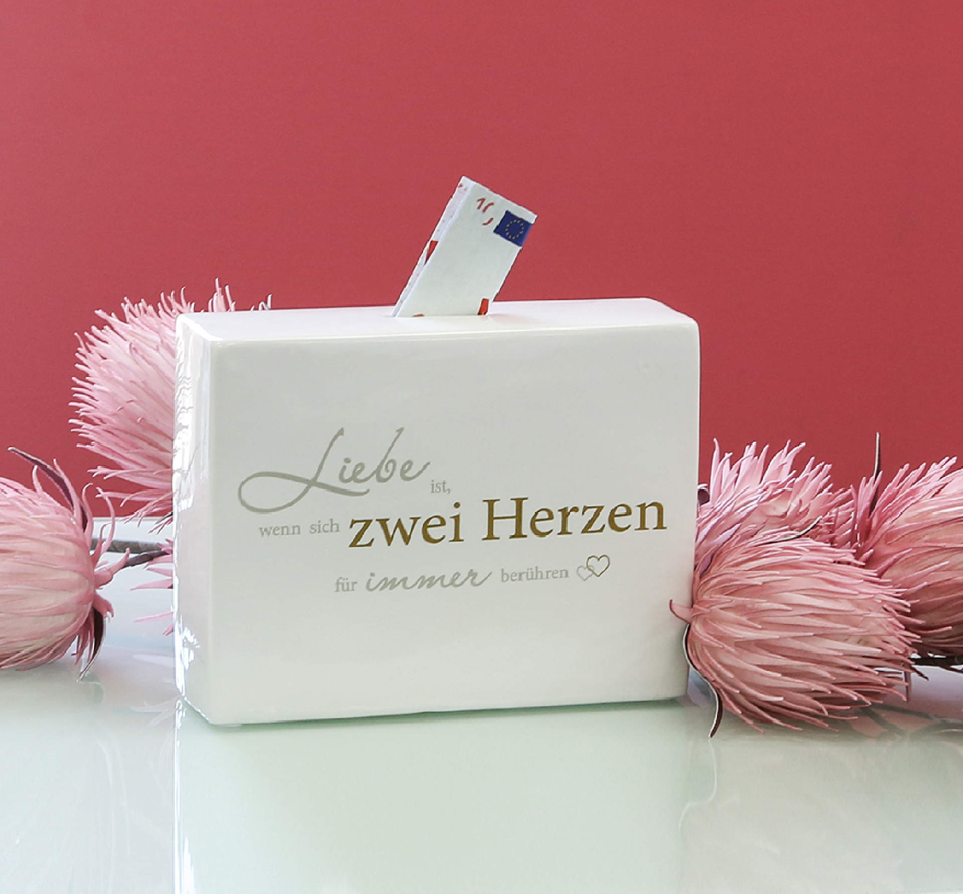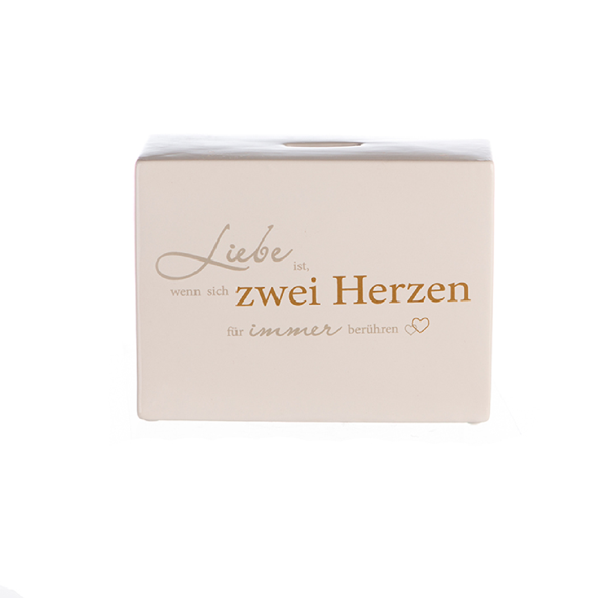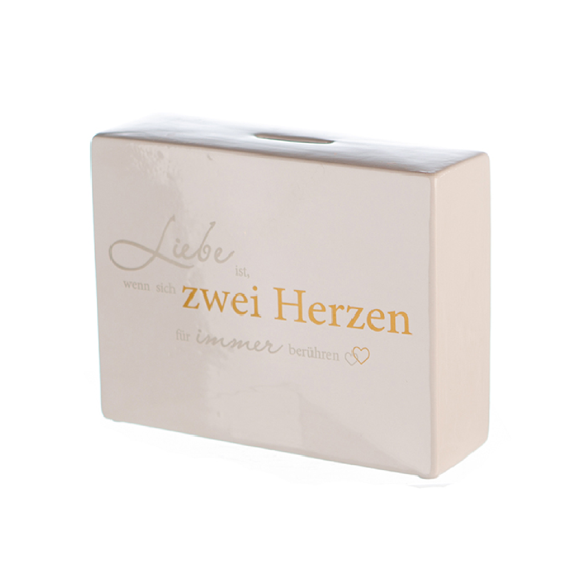 Spardose, rechteckig, "Herz an Herz", Spruch, Porzellan, weiß, L. 5,5 cm, B. 17,5 cm, H. 13,5 cm
