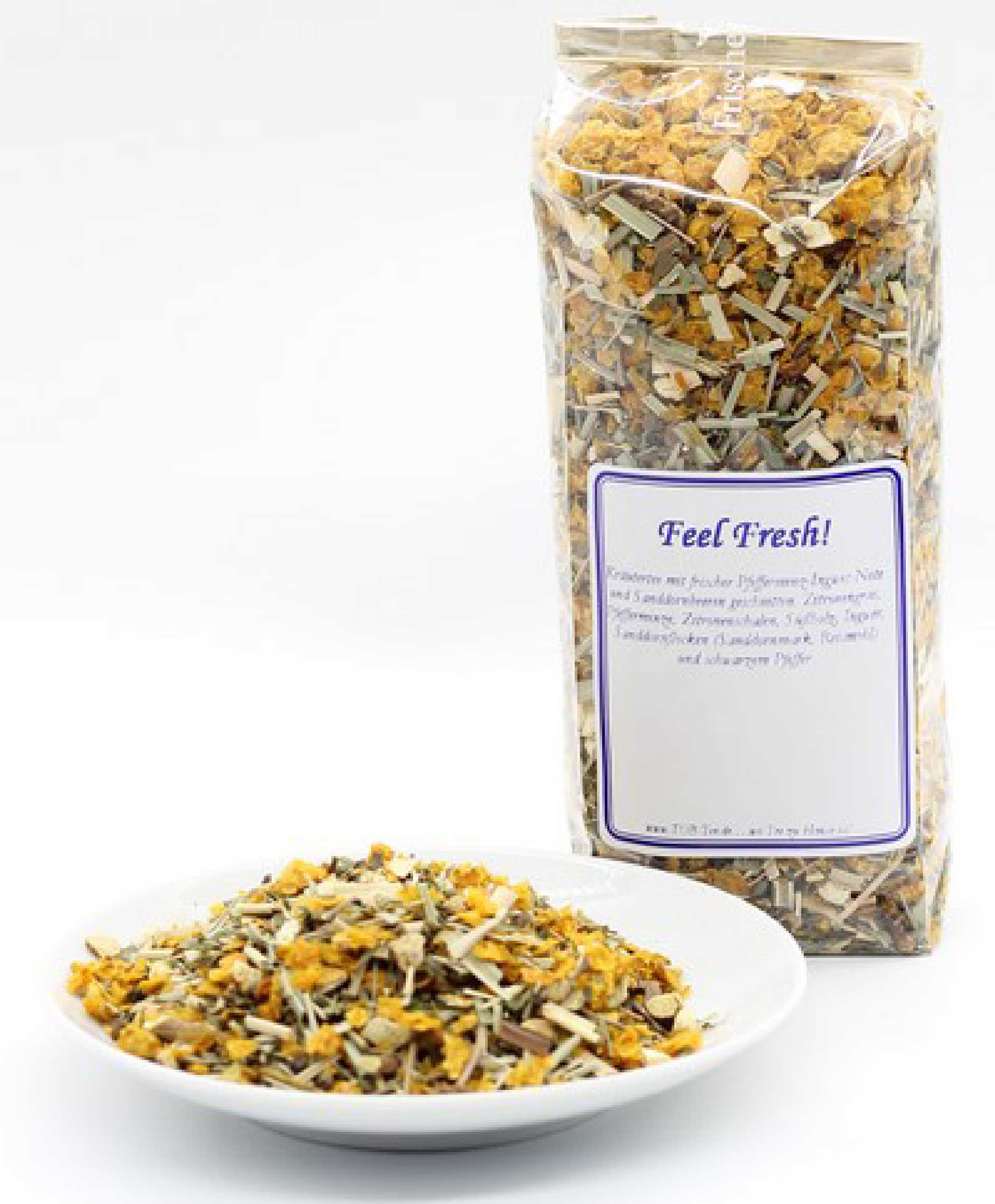 Kräutertee mit frischer Pfefferminz-Ingwer-Note und Sanddornbeeren geschnitten, Zitronengras, Pfefferminze, Zitronenschalen, Süßholz, Ingwer, Sanddornflocken (Sanddornmark, Reismehl) und schwarzem Pfeffer