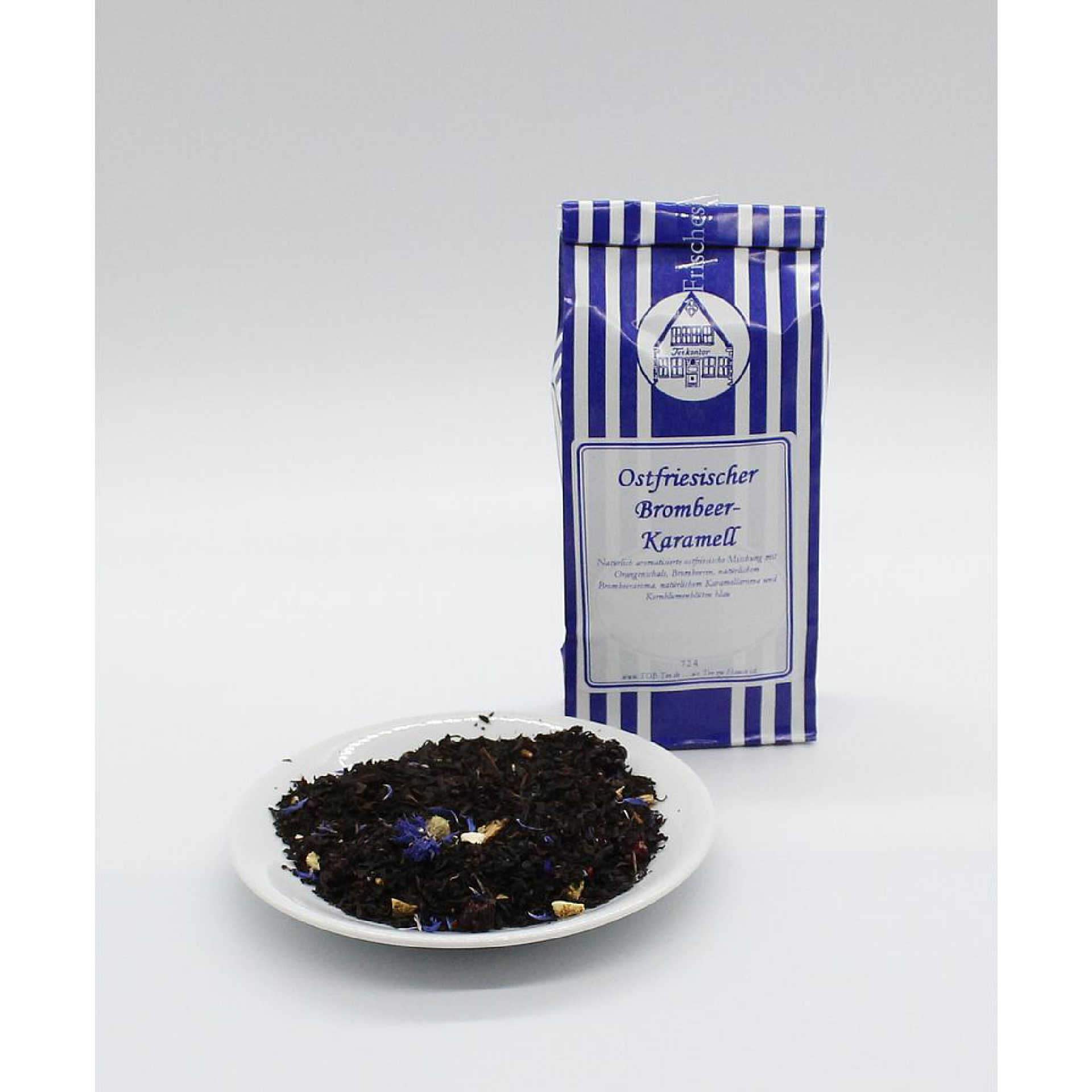 Natürlich aromatisierte ostfriesische Mischung mit Orangenschale, Brombeeren, natürlichem Brombeeraroma, natürlichem Karamellaroma und Kornblumenblüten blau