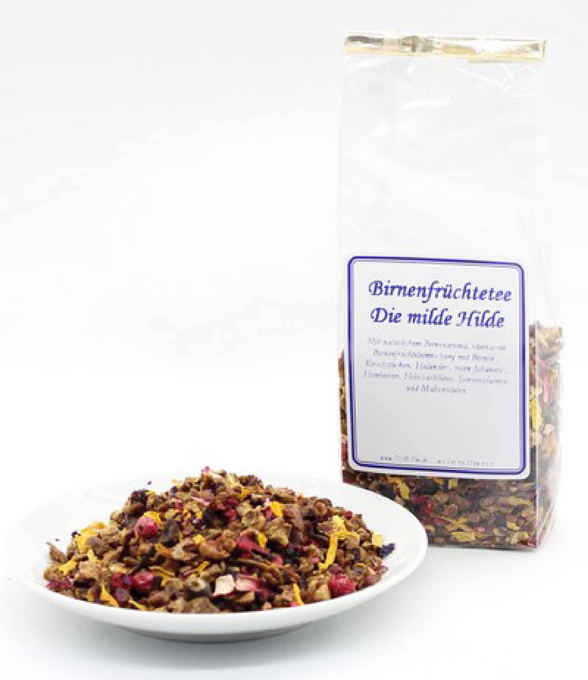 Mit natürlichem Birnenaroma, säurearme Birnenfrüchteteemischung mit Birnen-, Kirschstücken, Holunder-, roten Johannis-, Himbeeren, Hibiscusblüten, Sonnenblumen- und Malvenblüten