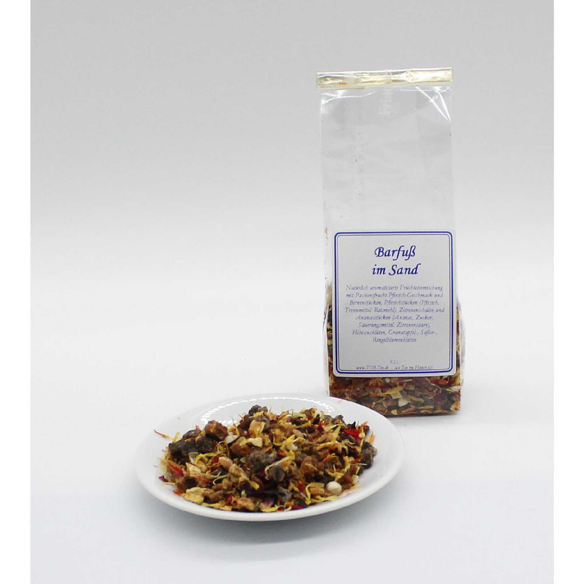 Säurearme, natürlich aromatisierte Früchteteemischung mit Passionsfrucht-Pfirsich-Geschmack und Birnenstücken, Pfirsichstücken (Pfirsich, Trennmittel: Reismehl), Zitronenschalen und Ananasstücken (Ananas, Zucker, Säuerungsmittel: Zitronensäure), Hibiscusblüten, Granatapfel-, Saflor-, Ringelblumenblüten