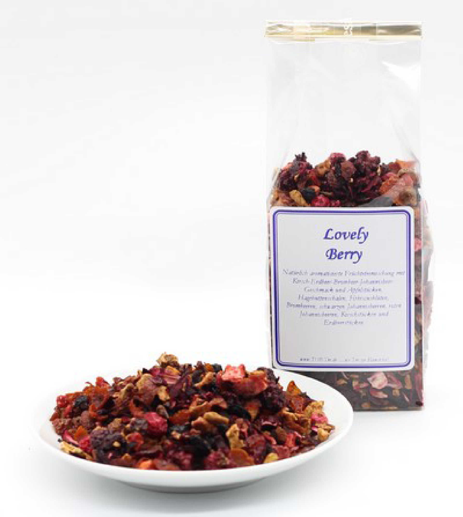 Natürlich aromatisierte Früchteteemischung mit Kirsch-Erdbeer-Brombeer-Johannisbeer-Geschmack und Apfelstücken, Hagebuttenschalen, Hibiscusblüten, Brombeeren, schwarzen Johannisbeeren, roten Johannisbeeren, Kirschstücken und Erdbeerstücken
