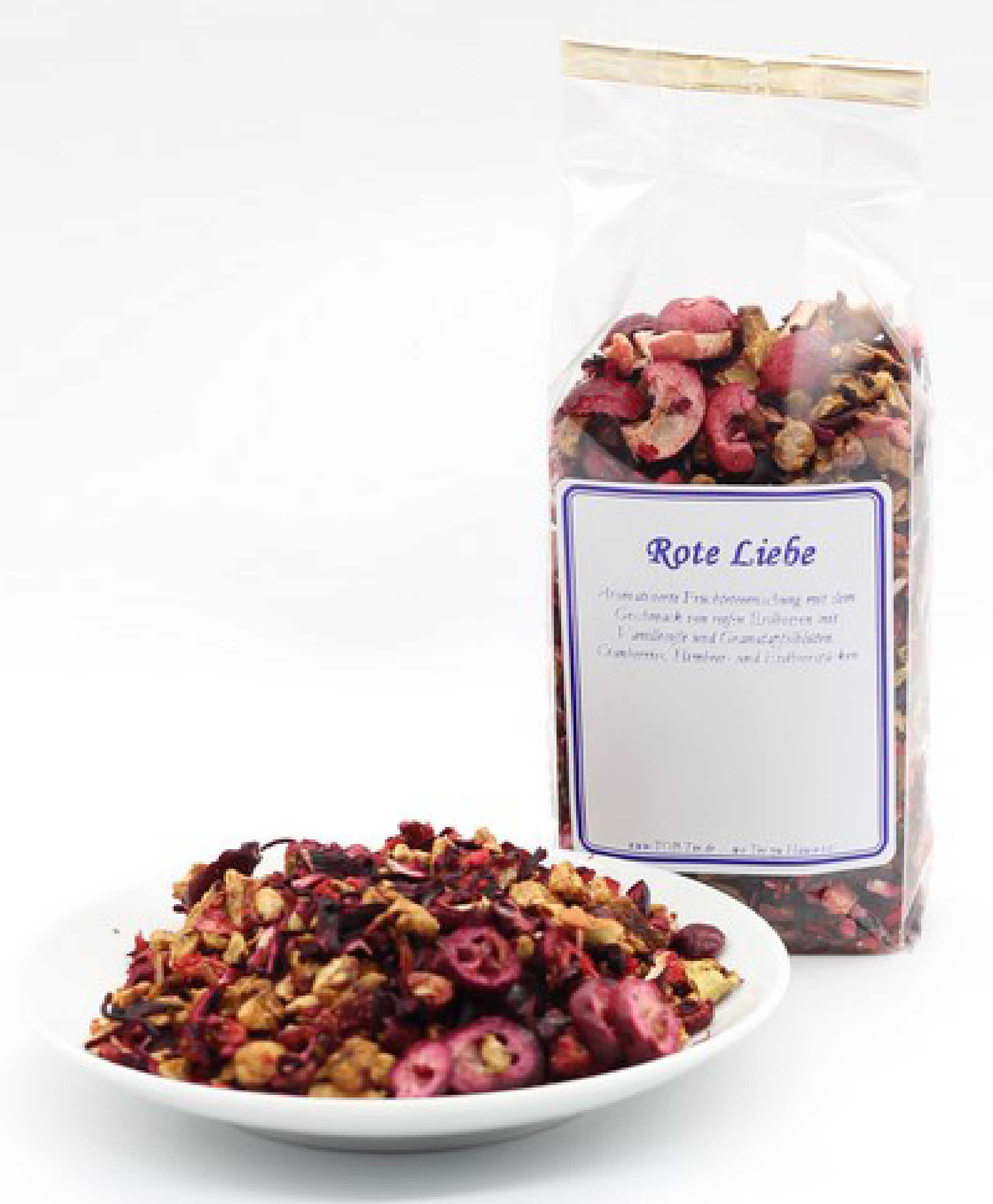 Aromatisierte Früchteteemischung (Hibiscus, Hagebutte und Apfel) mit dem Geschmack von reifen Erdbeeren mit Vanillesoße und Granatapfelblüten, Cranberries, Himbeer- und Erdbeerstücken