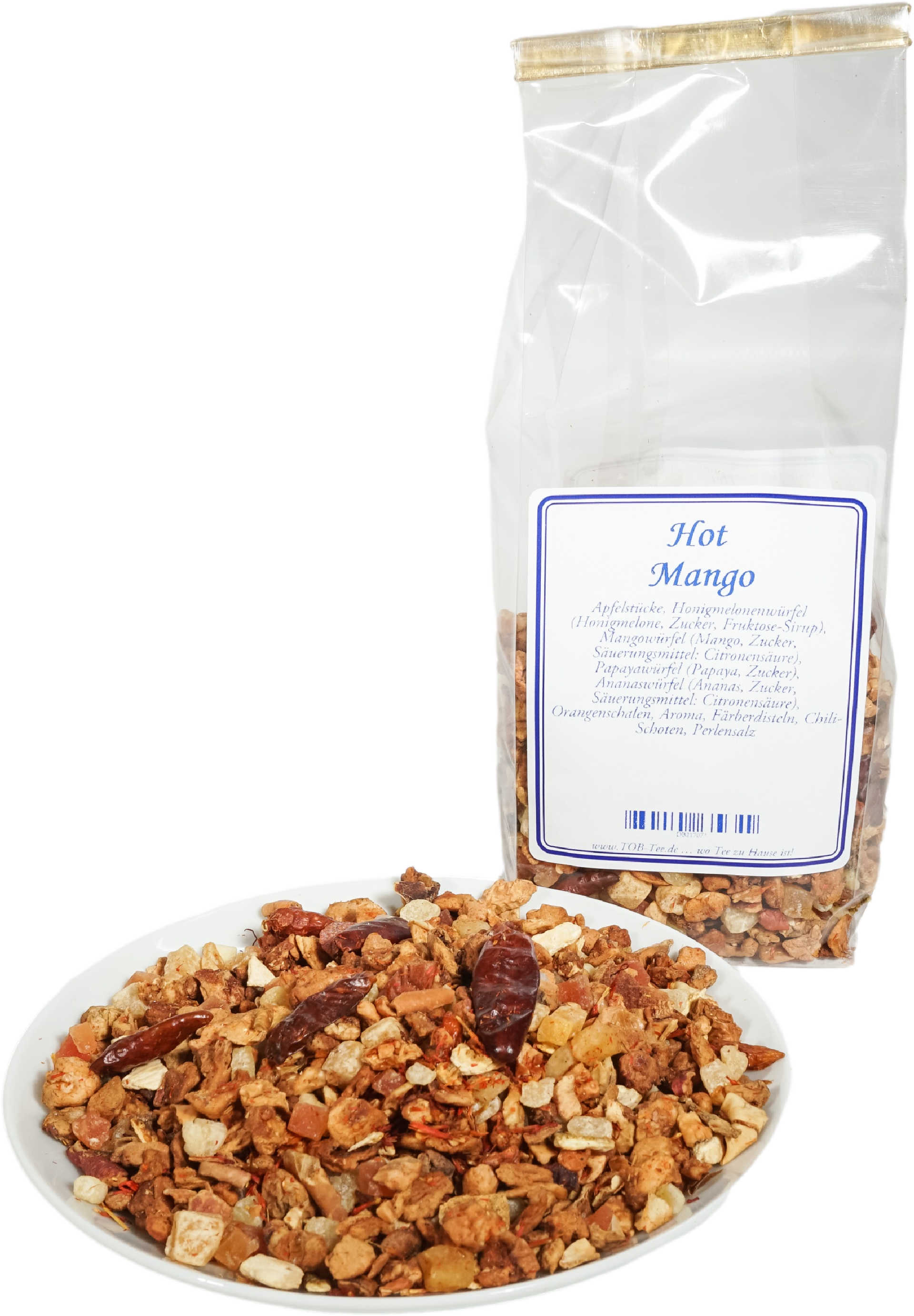 Apfelstücke, Honigmelonenwürfel (Honigmelone, Zucker, Fruktose-Sirup), Mangowürfel (Mango, Zucker, Säuerungsmittel: Citronensäure), Papayawürfel (Papaya, Zucker), Ananaswürfel (Ananas, Zucker, Säuerungsmittel: Citronensäure), Orangenschalen, Aroma, Färberdisteln, Chili-Schoten, Perlensalz
