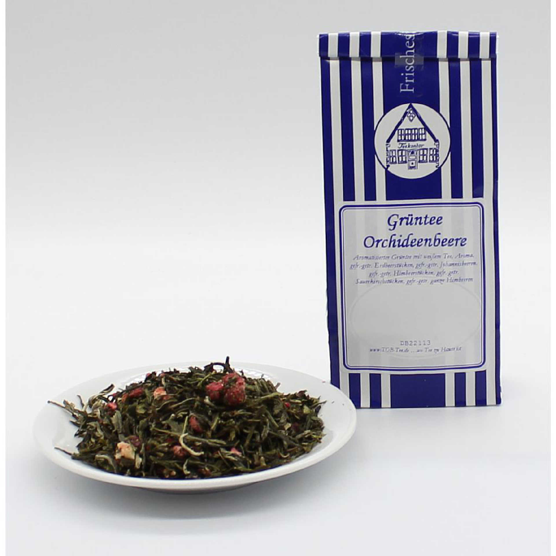 Aromatisierter Grüntee mit weißem Tee, Aroma, Erdbeerstücken, Johannisbeeren, Himbeerstücken, Sauerkirschstücken, ganze Himbeeren.