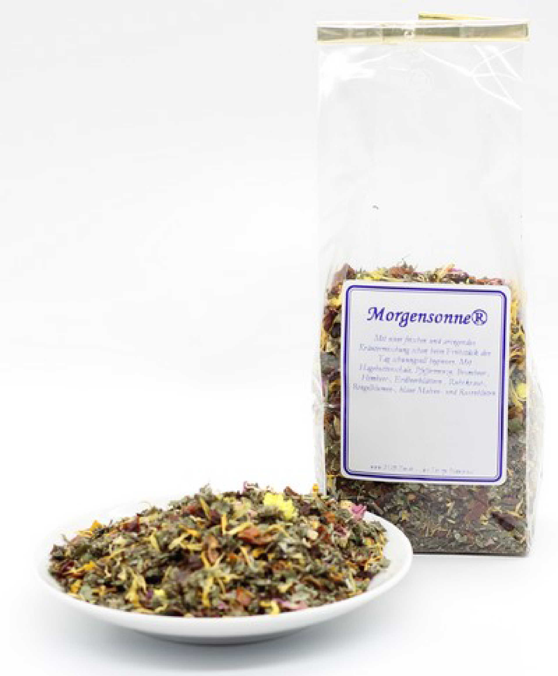 Mit einer frischen und anregenden Kräutermischung schon beim Frühstück den Tag schwungvoll beginnen. Mit Hagebuttenschale, Pfefferminze, Brombeer-, Himbeer-, Erdbeerblättern, Ruhrkraut-, Ringelblumen-, blaue Malven- und Rosenblüten